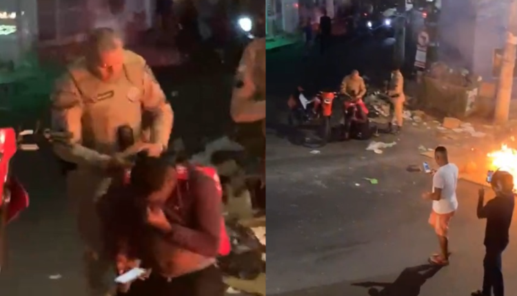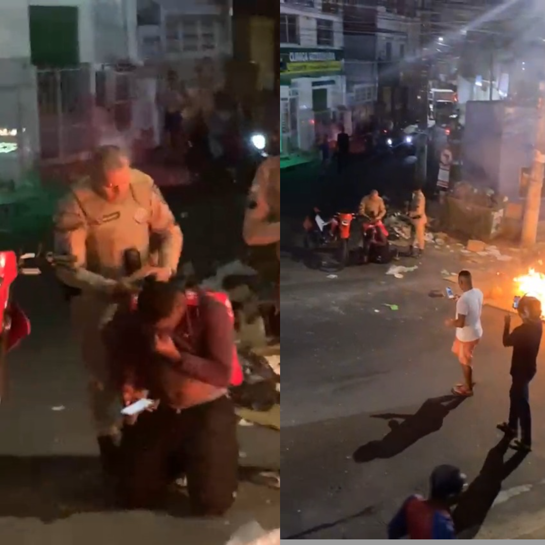 Nos vídeos, é possível ver policiais próximos ao foco do incêndio, enquanto populares observam a movimentação. Em outro momento, um homem aparece no meio da rua, próximo às chamas, evidenciando o clima de tensão e risco.