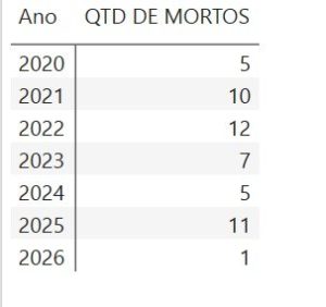 Em 2020, foram aproximadamente 6 mortos para cada 100 acidentes (5 mortes para 83 acidentes). Já em 2021, a taxa dobrou para cerca de 0,13, com 10 mortes em um ano de menos acidentes (78). O ano de 2022 (Pico de Letalidade) atingiu o nível mais elevado do período completo, com aproximadamente 0,14 mortos por acidente (12 mortes para 86 acidentes).