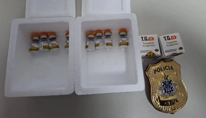 Durante a abordagem, os policiais encontraram com o suspeito duas caixas de isopor utilizadas para acondicionamento térmico. No interior, foram localizadas oito ampolas identificadas como T.G IS – Tirzepatida 15mg/0,5ml, de fabricação estrangeira. Segundo apurado no local, cada caixa contendo quatro ampolas estava sendo vendida por R$ 1.400.